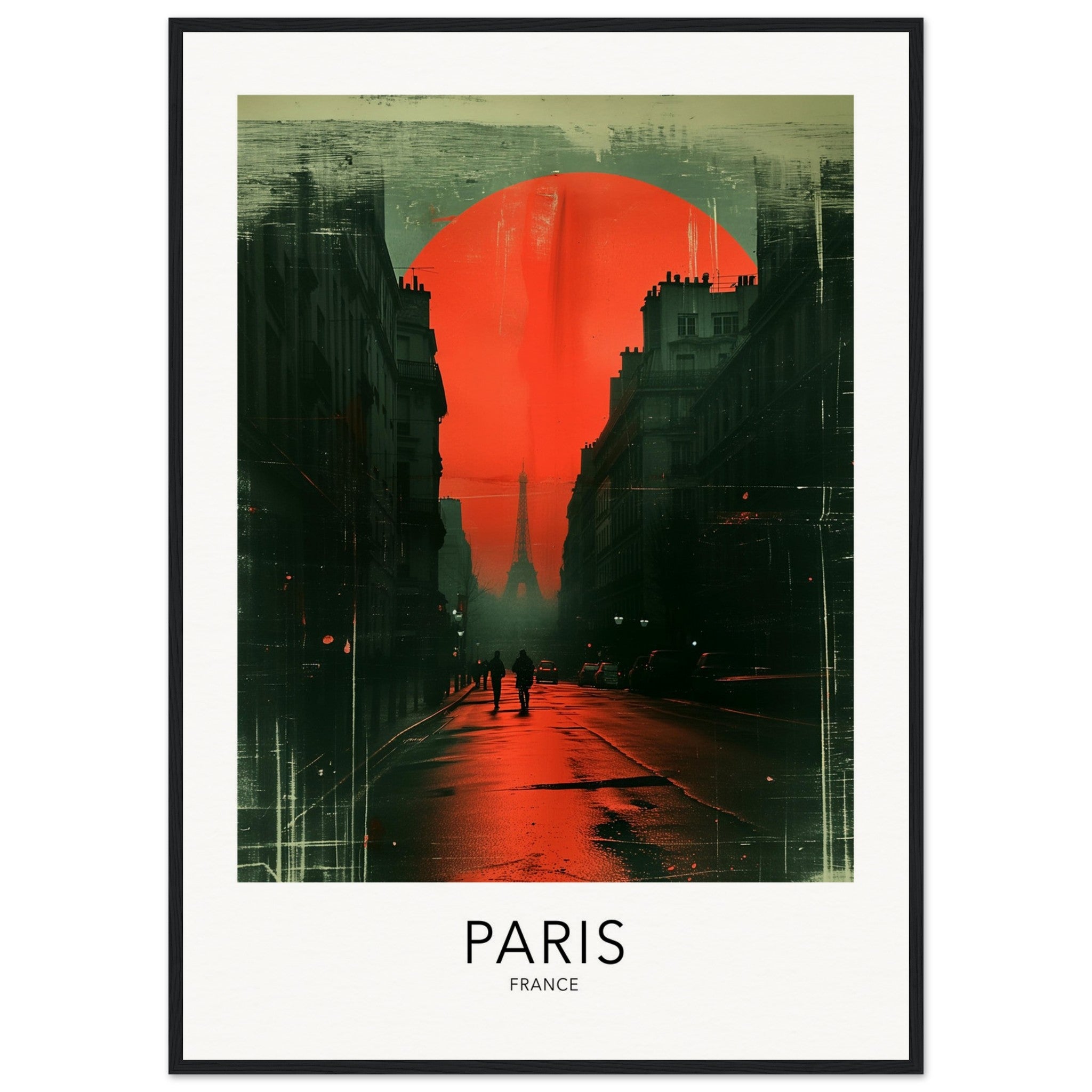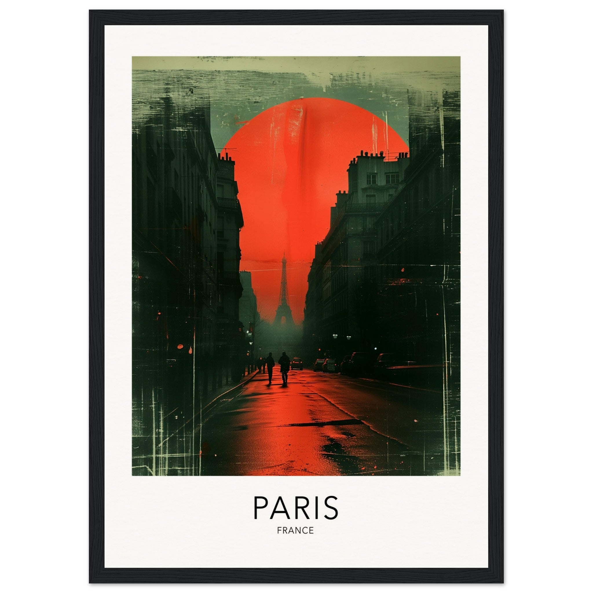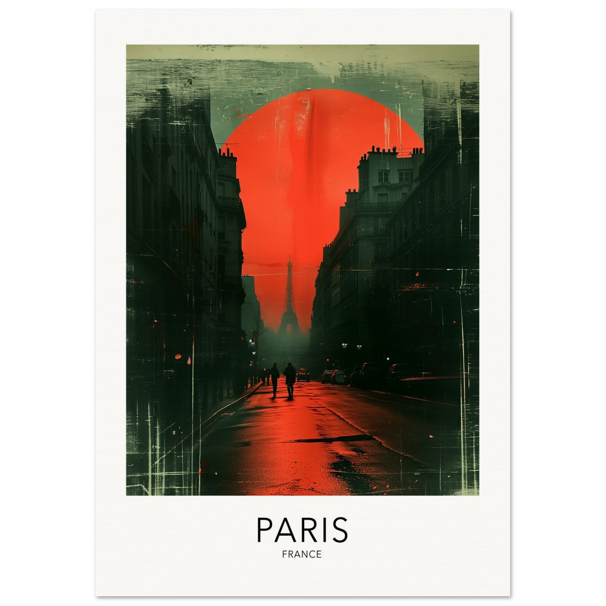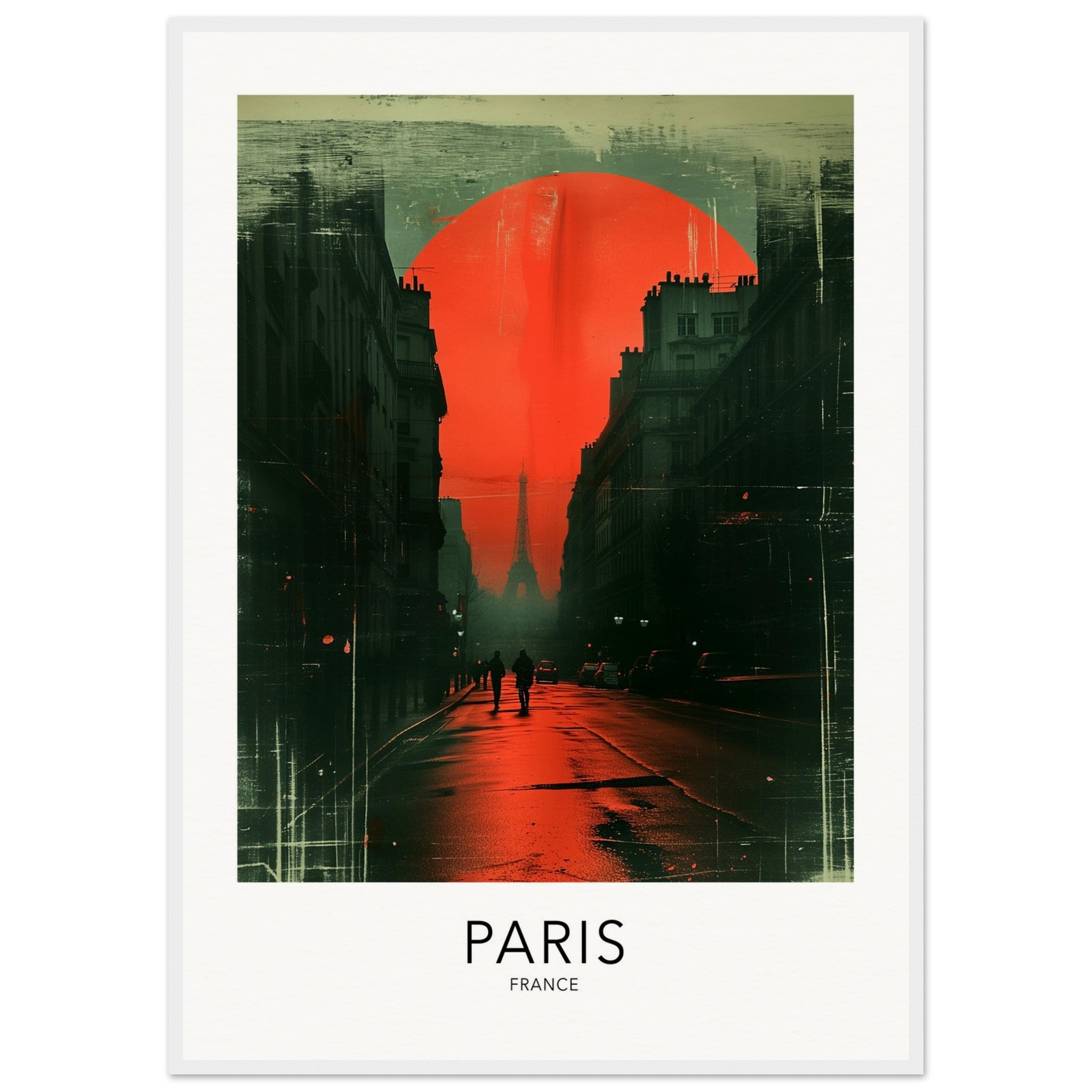 This evocative vintage-style travel poster captures the romantic essence of Paris, France through a dramatic street-level perspective leading toward the iconic Eiffel Tower. The design features a striking composition where Parisian buildings frame the famous landmark, creating a natural window effect that draws the eye toward the tower silhouetted against a brilliant orange sun. The weathered aesthetic and muted color palette of sage greens and warm oranges evoke the nostalgic charm of classic French travel advertisements, while the rain-slicked street and shadowy figures add an atmospheric quality that speaks to Paris's reputation as a city of romance and mystery.