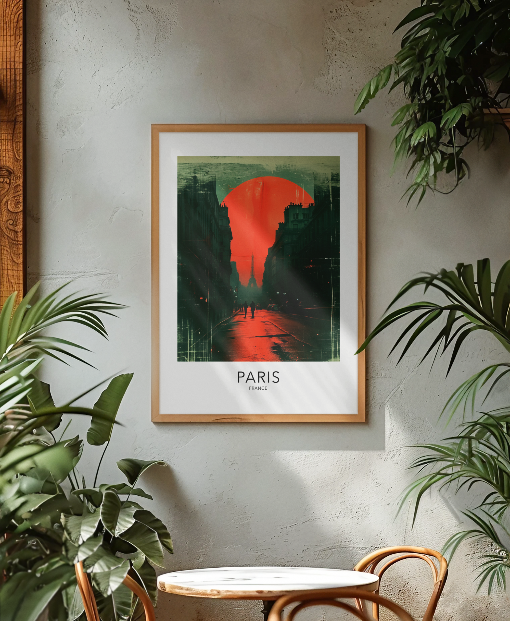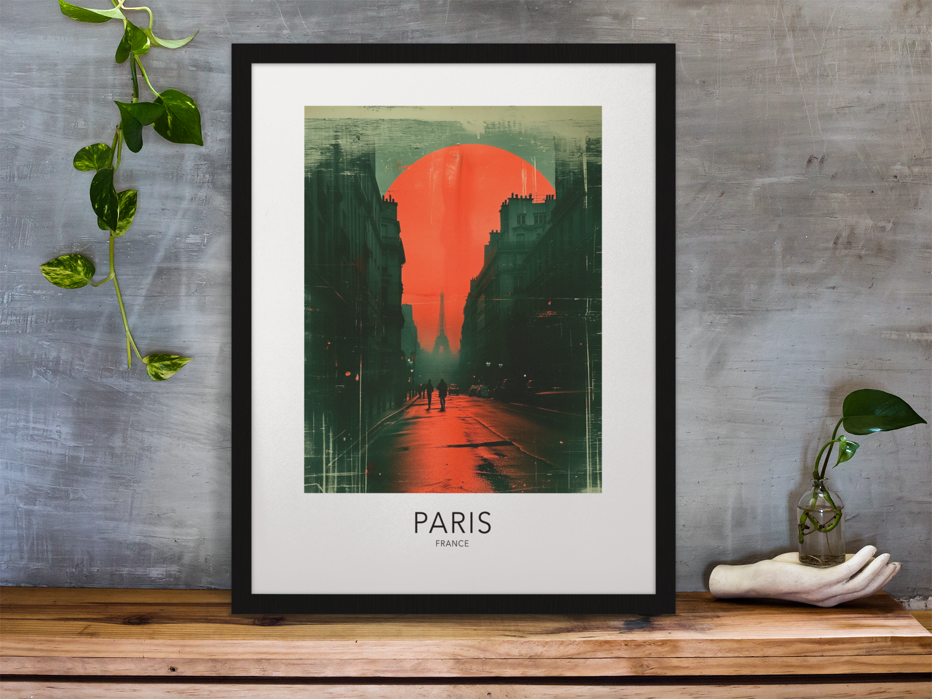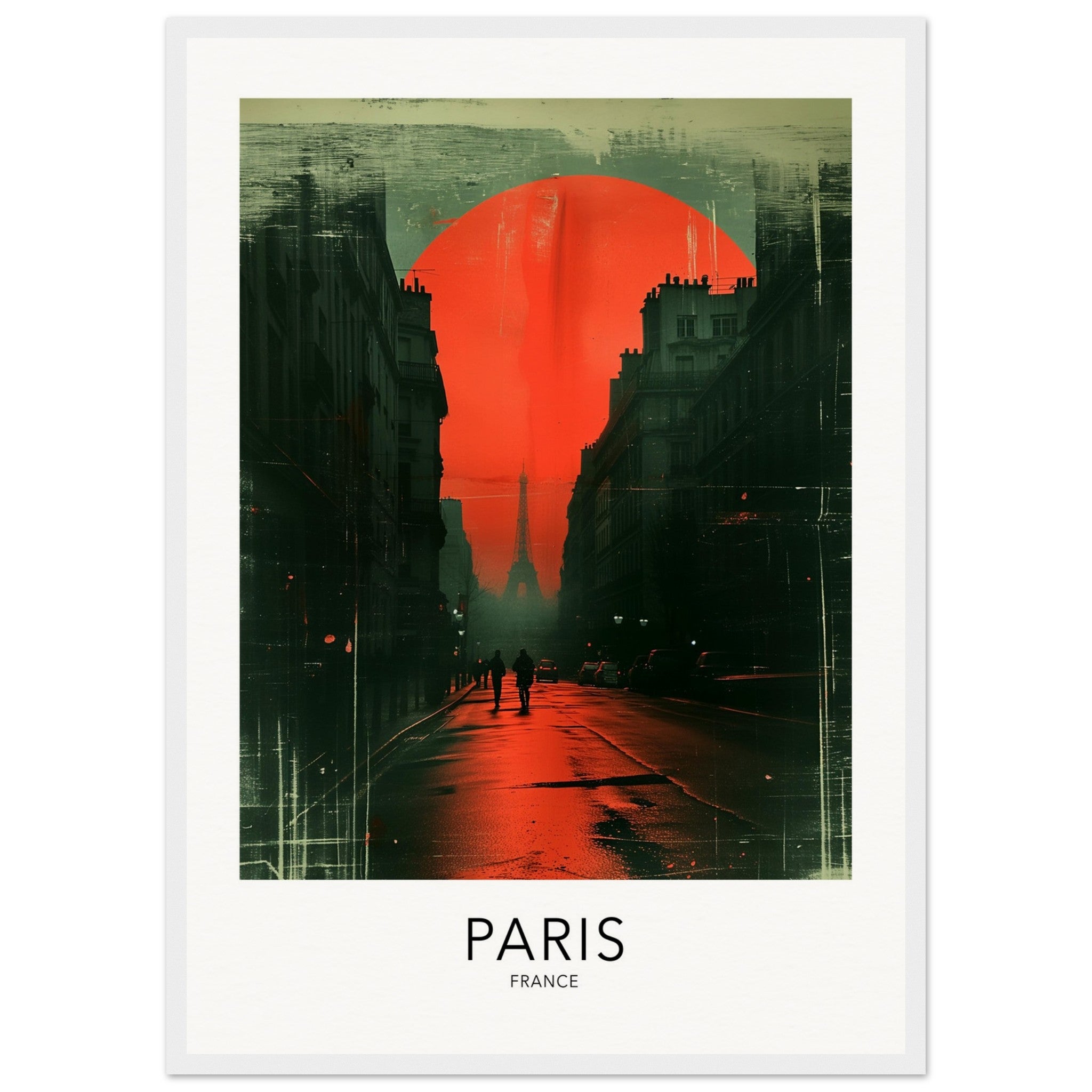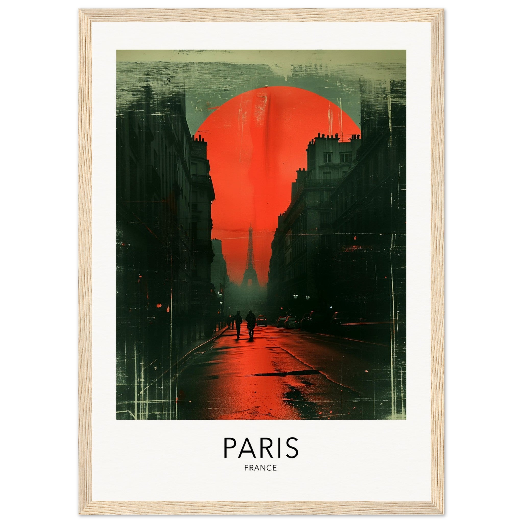 This evocative vintage-style travel poster captures the romantic essence of Paris, France through a dramatic street-level perspective leading toward the iconic Eiffel Tower. The design features a striking composition where Parisian buildings frame the famous landmark, creating a natural window effect that draws the eye toward the tower silhouetted against a brilliant orange sun. The weathered aesthetic and muted color palette of sage greens and warm oranges evoke the nostalgic charm of classic French travel advertisements, while the rain-slicked street and shadowy figures add an atmospheric quality that speaks to Paris's reputation as a city of romance and mystery.