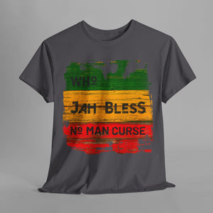 The shirt features a striking vintage-inspired design, showcasing Jah Bless Rasta motif