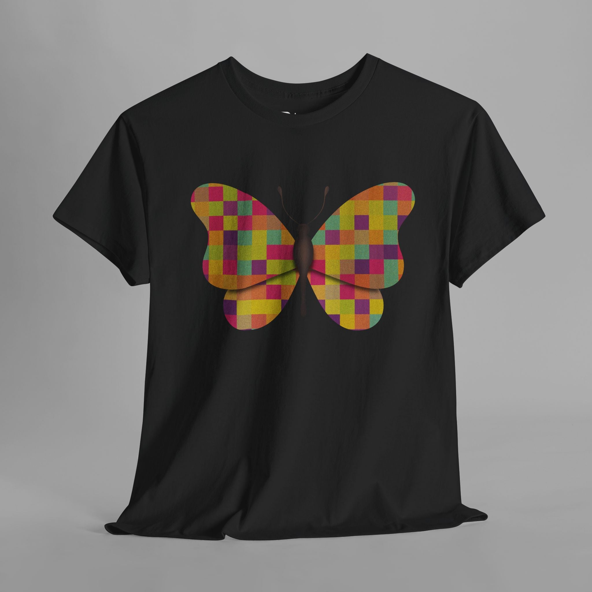 This design merges the natural beauty of butterflies with contemporary geometric art, resulting in a piece that's both organic and structured. The rich color palette and textured finish make this more than just apparel—it's wearable art that brings joy and brightness to any outfit.